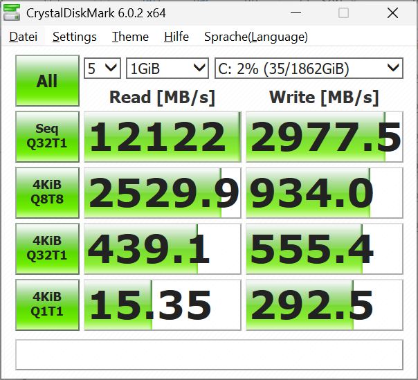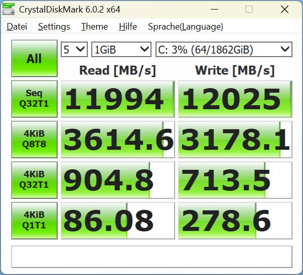 However, that only applies if proper cooling is ensured. Apparently, PCIe 5.0 SSDs get even hotter than their predecessors. The graphene sticker alone isn’t sufficient, especially in a tightly packed laptop case. The resulting heat initially caused the performance to drop significantly. Only with additional cooling pads and contact with the laptop chassis could the heat be dissipated, allowing the T-Force to make full use of its speed potential. Whether the graphene layer provides any real benefit or is mainly a marketing gimmick cannot be definitively determined in this test.