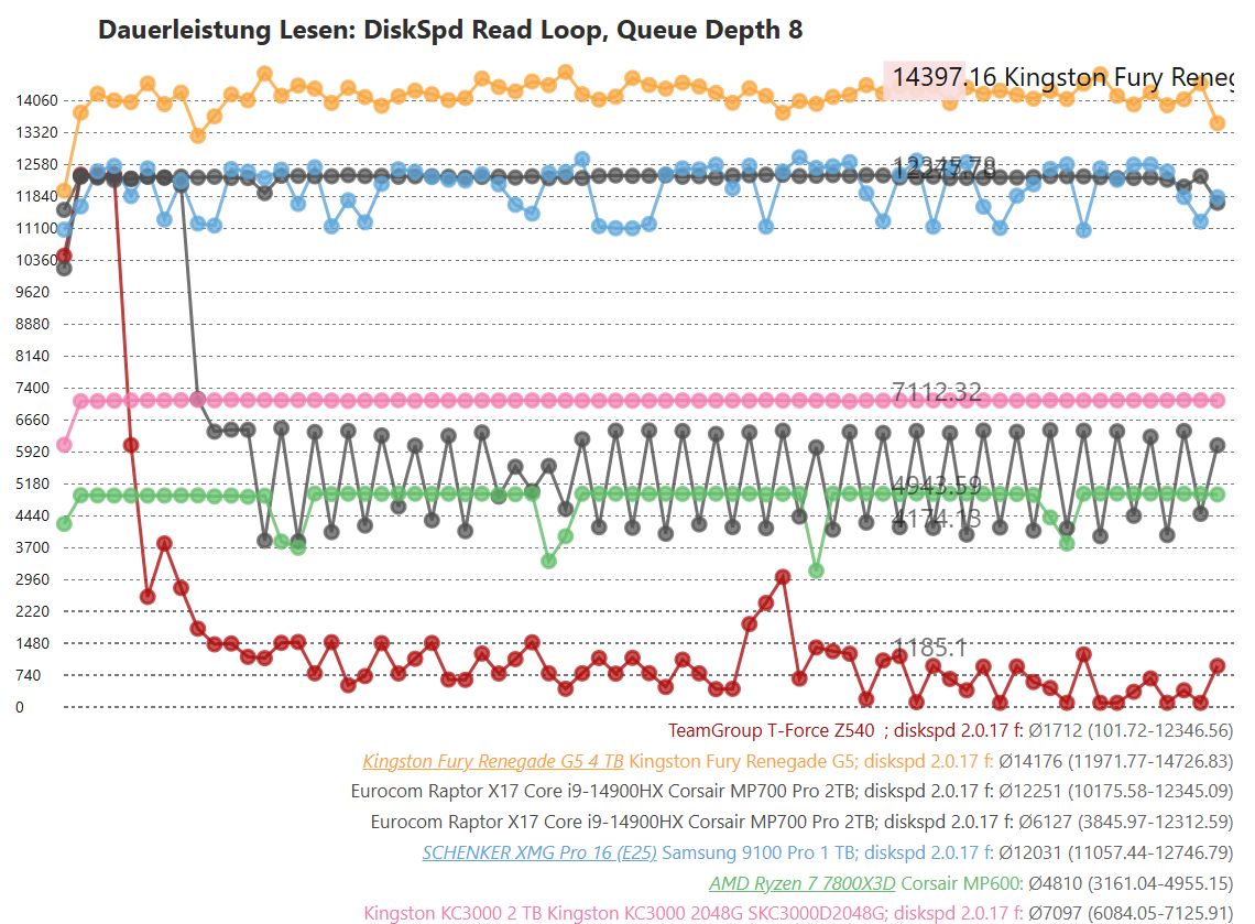 In our endurance test with DiskSpd, the T-Force Z540 also maintained consistently high performance. It doesn’t quite match the speed of the Kingston Fury Renegade G5, but the results are still remarkably strong
