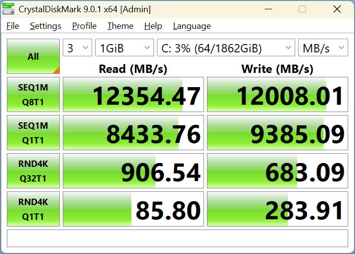 On the second attempt, the results look much better: according to CrystalDiskMark 6, the drive reaches almost 12,000 MB/s in both read and write speeds—an impressive result. CrystalDiskMark 9 shows even slightly higher numbers, while AS SSD is a bit more restrained.