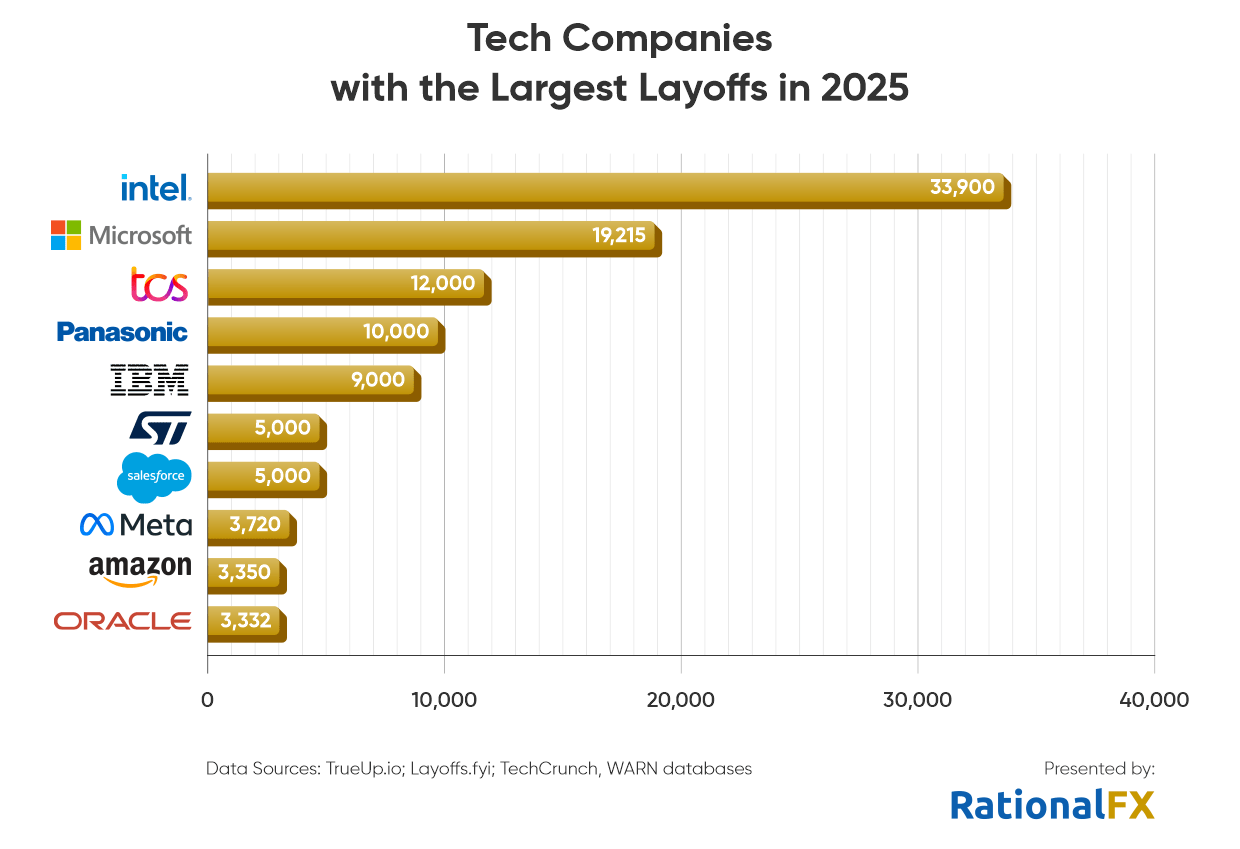Microsoft isn’t far behind. The Redmond-based giant has already gone through multiple rounds of layoffs: roughly 6,000 roles in April and another 9,000 in July, RationalFX foresees a total of at least 19,215 positions in 2025 eliminated in the name of efficiency.