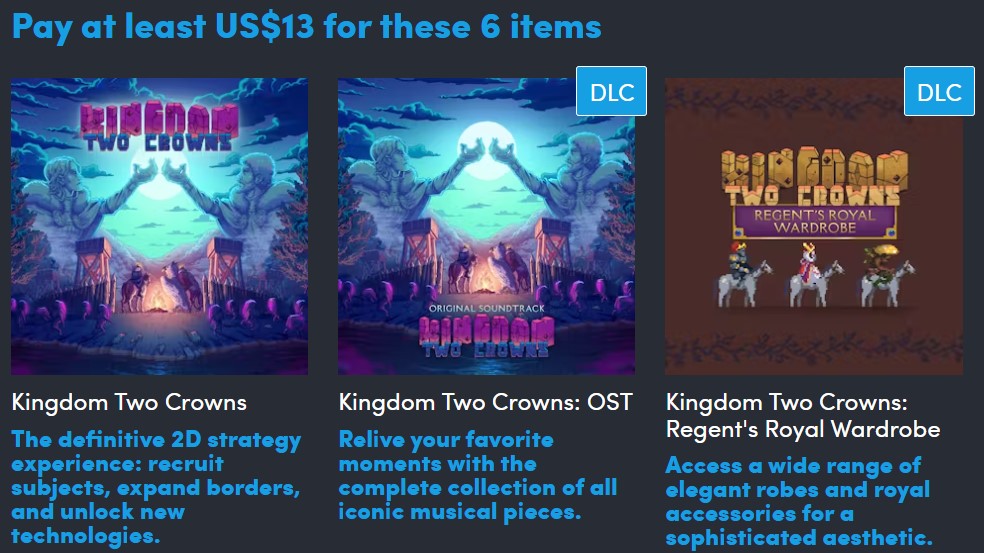 - Kingdom Two Crowns - OST: This DLC adds a soundtrack to the base game. It is worth $9.99.
