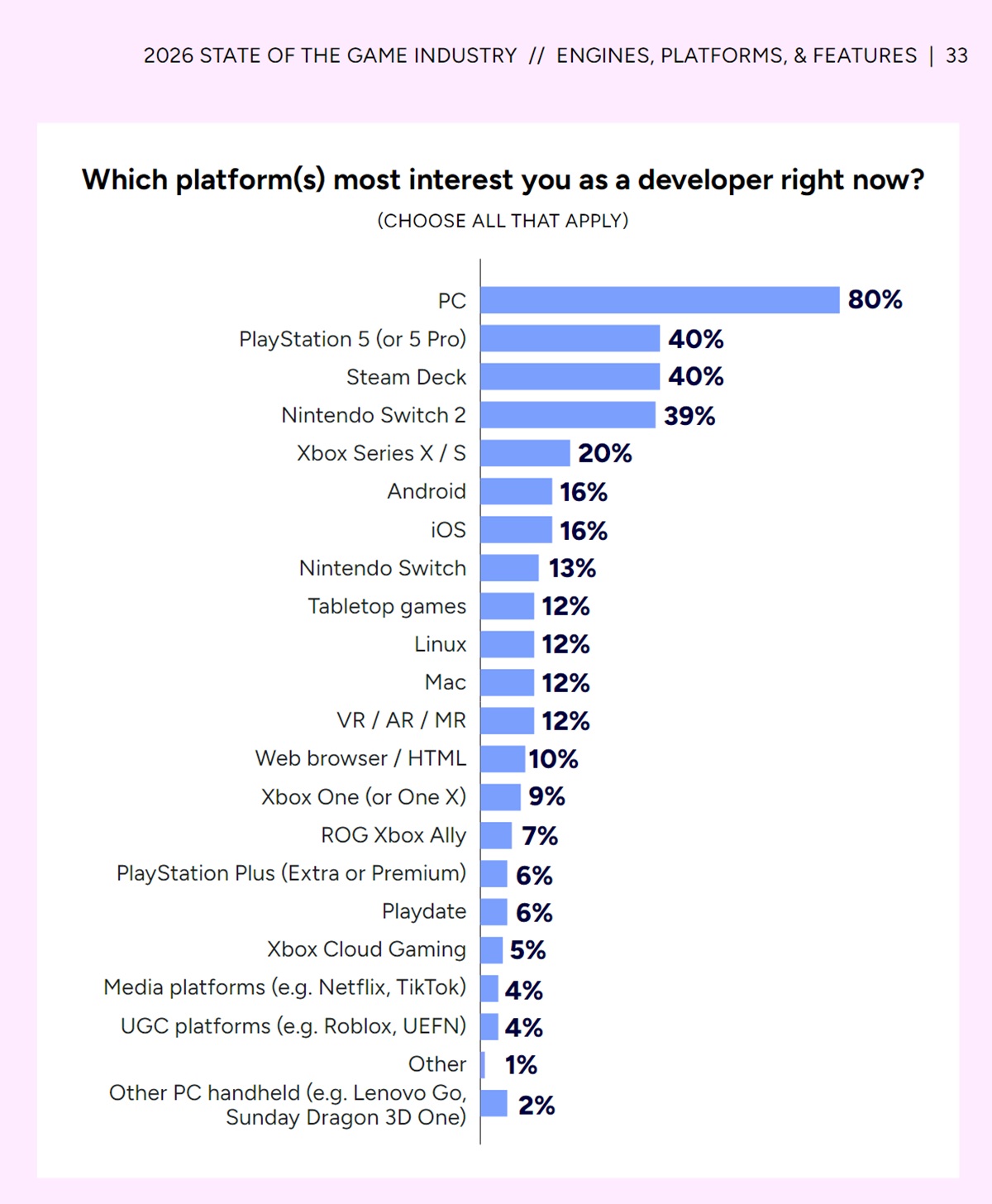 Like in the 2025 report, desktop and laptop gaming remain a top priority for these creators. No individual console has the same massive user base, and popular marketplaces like Steam have fewer restrictions. That support even extends to the Linux-based Steam Deck, which scored an impressive 40%.