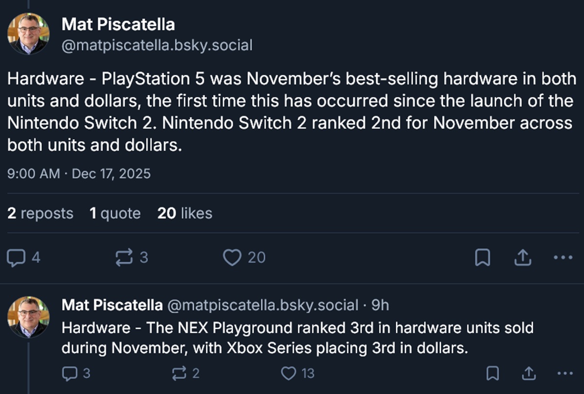 Mat Piscatella Bluesky post on November hardware sales drop (Image source: screenshot, Mat Piscatella Bluesky account)