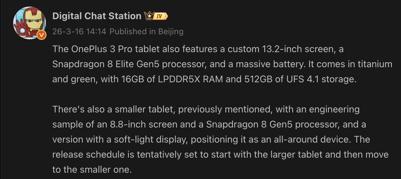 Apart from the OnePlus Pad 3 Pro, the company is reportedly working on a compact tablet with an 8.8-inch screen. It will feature the Snapdragon 8 Gen 5, a sub-flagship Qualcomm processor. The tablet is also tipped to have a variant with a "soft light" display.