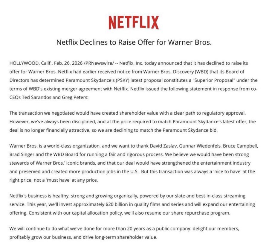 On December 5, 2025, Netflix published an official announcement according to which the streaming platform fully negotiated and financed a definitive agreement to acquire Warner Bros. including its film and television studios, HBO Max and HBO. The cash and stock transaction was valued at $82.7 billion (equity value of $72 billion). However, this actually was not a definitive agreement, as the bidding for WBD remained open, with Paramount Skydance continuing to make offers in the meantime. On February 26, the Warner Bros. Discovery board deemed Paramount’s latest bid “superior” to the initial Netflix agreement. This higher bid would see Paramount Skydance acquiring 100% of WBD for approximately $111 billion. Netflix refused to counter with a higher offer and Paramount now looks poised to completely own WBD.