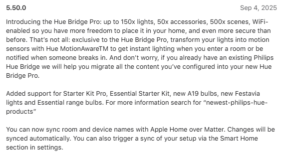 The company also states that users can now sync Apple Home over Matter. As for HomeKit, users of the Pro Bridge will have to reconnect the two via Matter after migrating. It appears that users of the Hue Bridge will still be able to use the original HomeKit integration.
