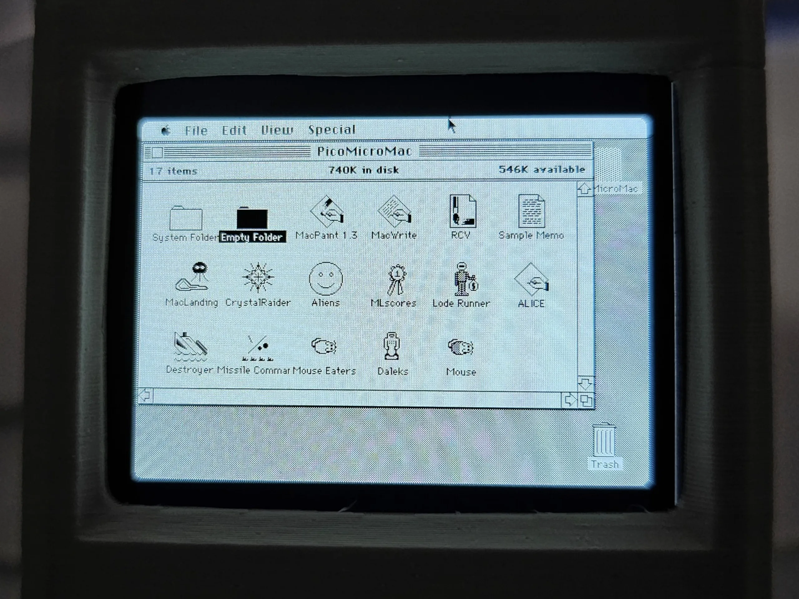 | Modified Raspberry Pi Pico with flashed firmware and pre-installed Macintosh System 3.2 boot disk |