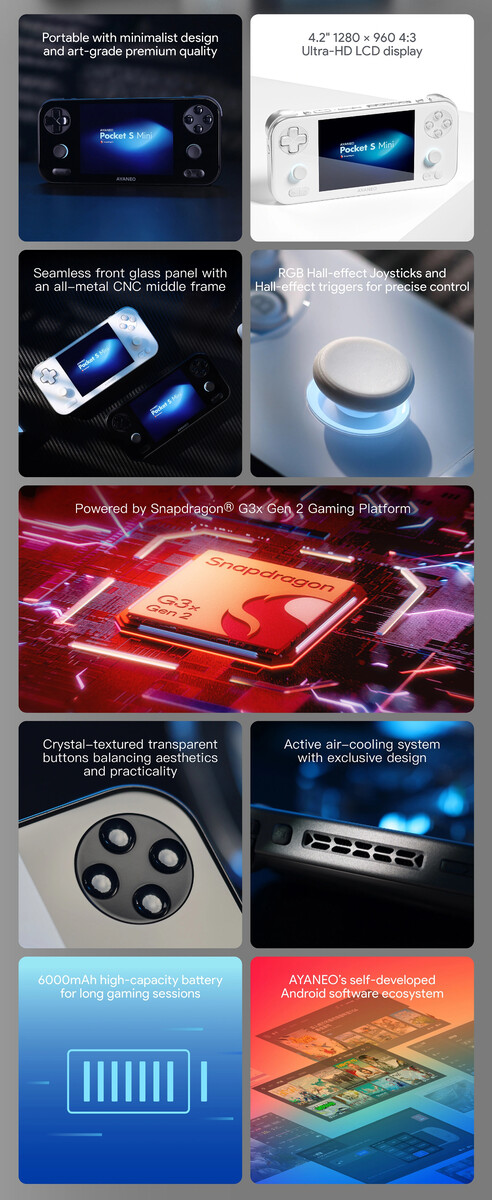 Additionally, Ayaneo equips the Pocket S Mini with a 4.2-inch display with a 1,280 x 960-pixel native resolution and a 4:3 aspect ratio. There is no information about peak brightness values, though. Regardless, the Pocket S Mini also finds itself with LPDDR5X RAM clocked at 8,533 MT/s and UFS 4.0 flash storage or UFS 3.1 flash storage with 128 GB SKUs.