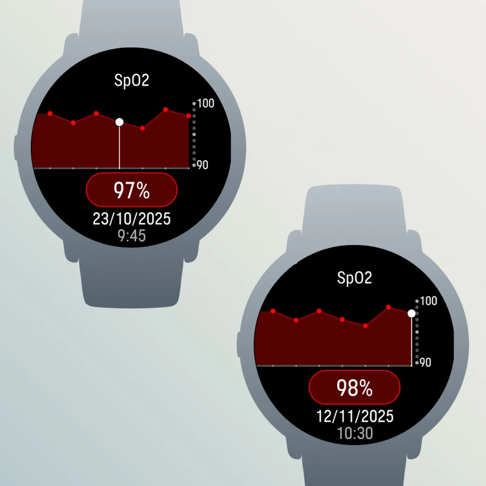 The smartwatch update primarily introduces convenience features. With Polar OS 5, it is now possible to set multiple alarms directly on the smartwatch, and watch faces get a night mode. As long as the "Do Not Disturb" mode is enabled, the display only lights up a bit when a button is pressed, while some watch faces can now show a more minimalistic time format. Moreover, a new chart can display the blood oxygen saturation over time.