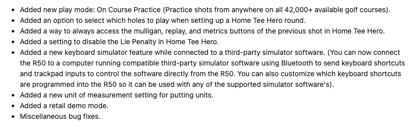 With software version 4.80, users of the Approach R50 gain a host of new features. There is a new play mode, On Course Practice, which allows you to try out various shots on over 42,000+ golf courses. Users can now select which hole to play during a Home Tee Hero round, and you can disable the Lie Penalty in this mode. Plus, users can now access the mulligan, replay, and metrics buttons of the previous shot in Home Tee Hero.