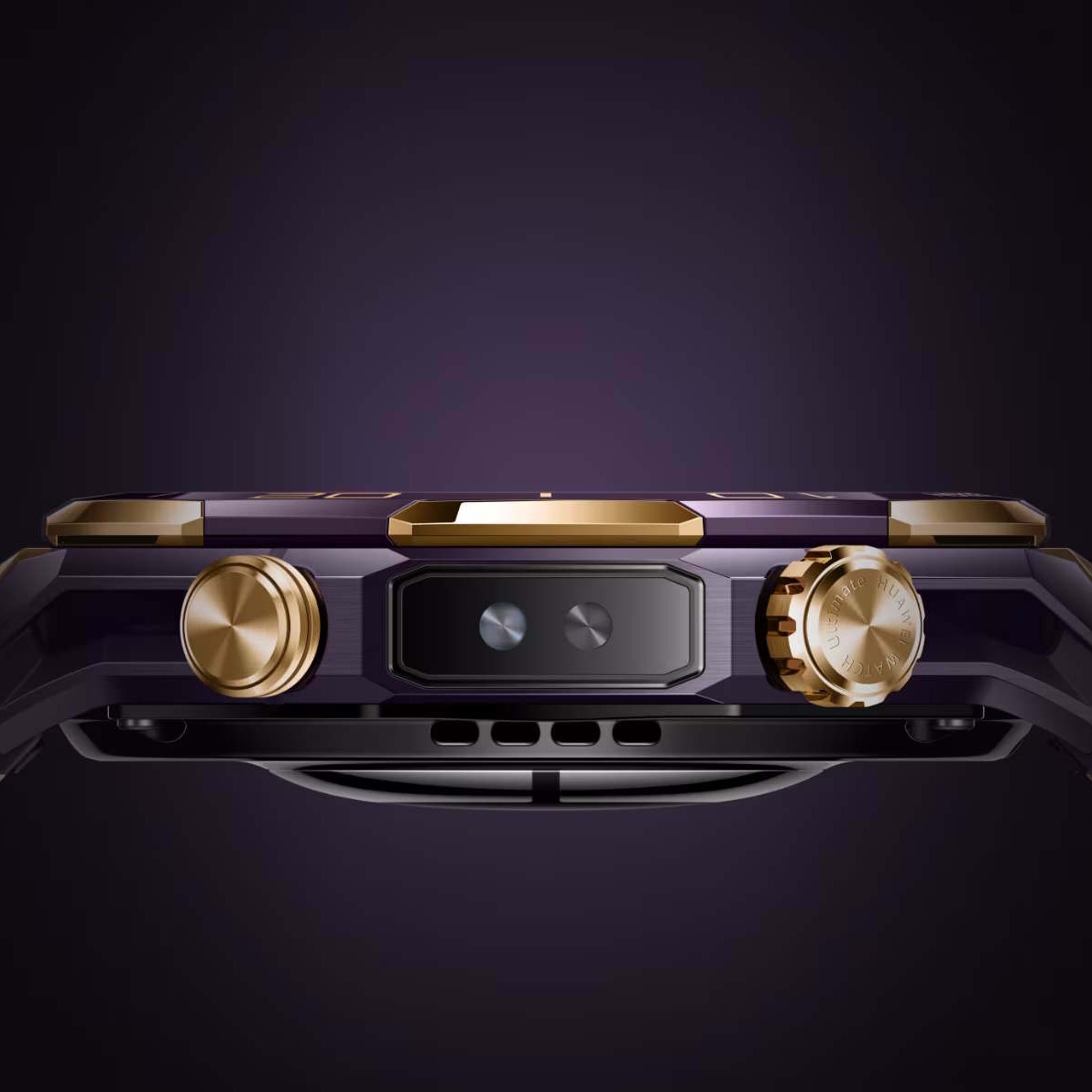 The Huawei Watch Ultimate Design Royal Gold has a purple and gold design, featuring a ceramic bezel with 18K and 24K gold accents. The casing is made from a zirconium-based liquid metal, which is said to be particularly resilient, and the hollow case helps to make it lighter. The watch comes with a durable purple and gold titanium alloy strap, the face is protected by sapphire glass, and its crown is also plated with 18K gold.