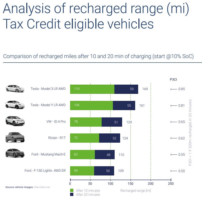 Among cheaper EVs eligible for the federal government's US$7,500 of tax credit subsidy, the Tesla Model Y and Model 3 proved to have the most efficient charging speeds with all the rest far behind. Still, the tax credit-eligible electric cars as a group charged much slower on aggregate than the more expensive EVs sold in the US. While this can be expected given their much higher prices, the KIA EV6 is a very pleasant outlier as it costs as much as a Model Y before the tax credits.