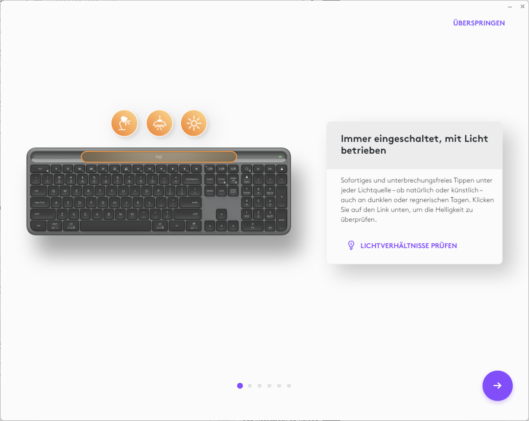 In addition to the keyboard itself, the package includes a brief user manual. The packaging is minimalistic and consists largely of recycled material, which is in line with Logitech's commitment to sustainability. The solar technology is particularly noteworthy: The keyboard has an integrated solar cell that can be charged by both natural and artificial light (at least 200 lux). This means that an external power source is usually unnecessary, further reducing the environmental impact. According to the manufacturer, just one hour of sunlight is enough to power the keyboard for several weeks.