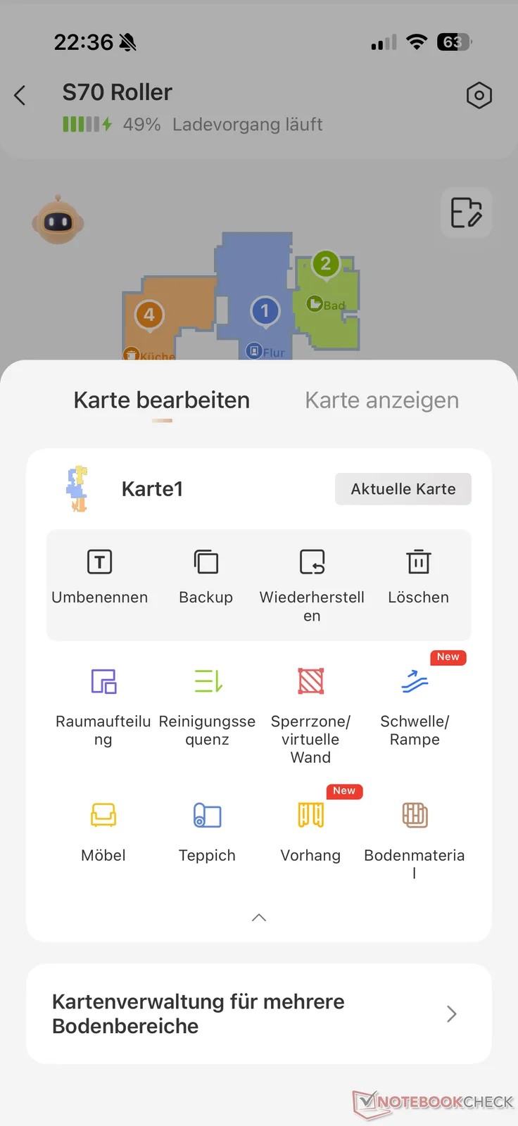 The set-up process for the Mova S70 Roller, i.e. the connection between the robot, app and Wi-Fi, worked without any problems during the test. This is followed by a short mapping run to create a virtual map. This was not as accurate as some flagship models in terms of automatic room recognition, but was adjusted with just a few taps using the clearly laid out map management system. After a few minutes, the Mova S70 Roller is ready for use.