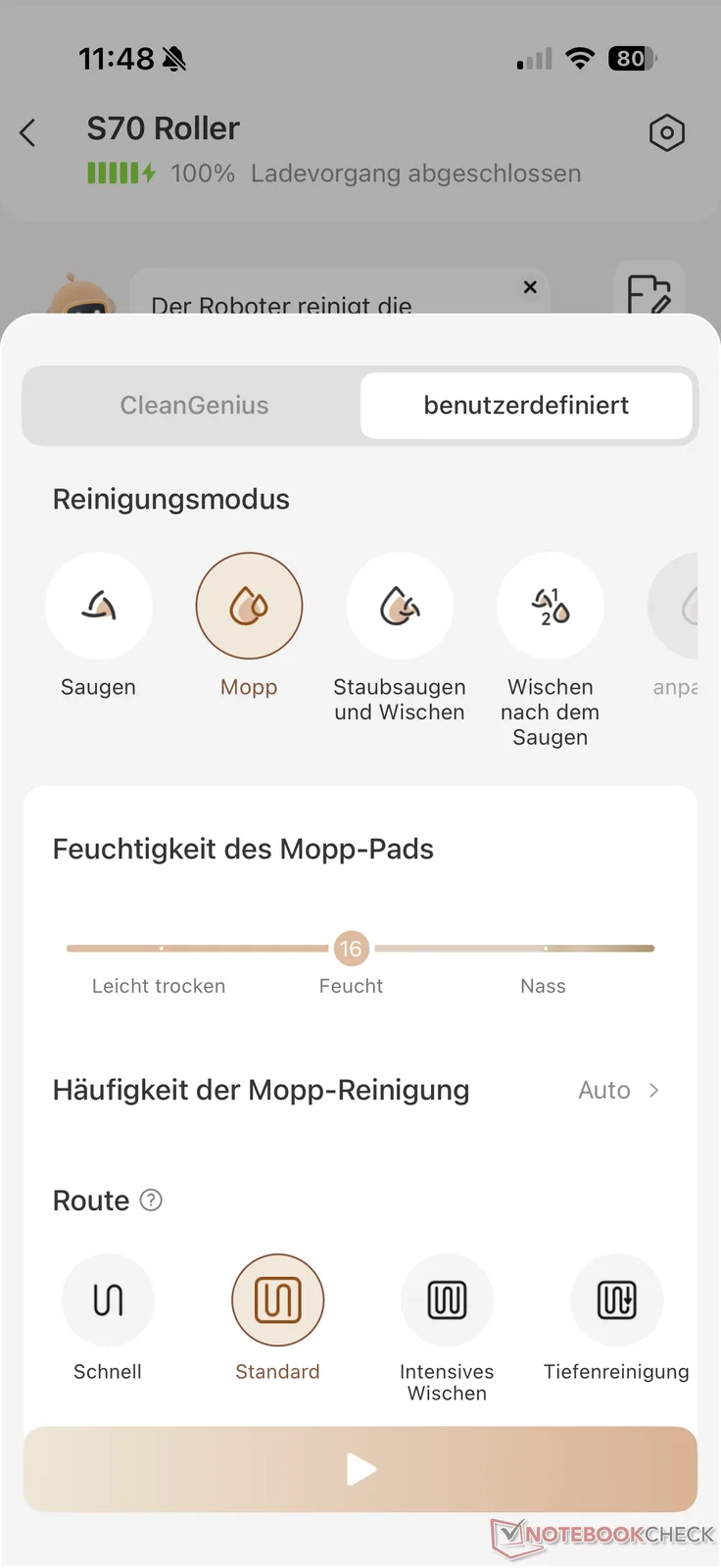 In the overview of the device entry, the app shows the live progress on the virtual map in the usual way when the robot hoover is at work. The four classic modes "Vacuum", "Mop", "Vacuum and mop" and "Mop after vacuuming" are available for this. The suction and mopping power for individual areas can also be set via "Customize". The suction power can be adjusted in four levels (Quiet, Standard, Intensive, Max) and the mopping moisture in 32 levels. There are also four route options (fast, standard, intensive mopping and deep cleaning).