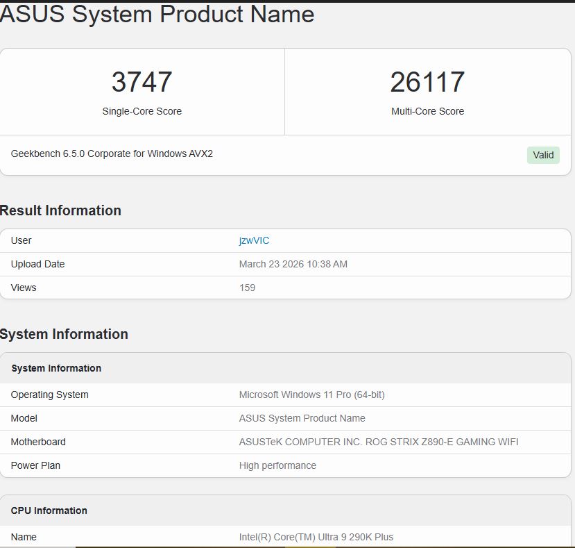 Spotted by HXL on X, the 24-core Core Ultra 9 290K Plus earned single-core and multi-core Geekbench 6.5 scores of 3,747 and 26,117, respectively. As is the case with other Arrow Lake Refresh CPUs, the Core Ultra 9 290K Plus was running at +100 MHz boost clock (5.8 GHz) compared to the Core Ultra 9 285K and was using the new Intel Binary Optimization (IBOT).