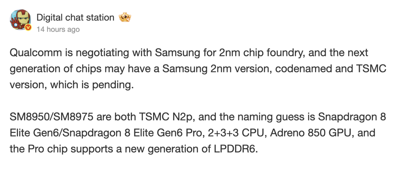 According to Digital Chat Station, TSMC may not be the only foundry that Qualcomm has turned to for its Snapdragon 8 Elite Gen 6 generation chipsets. Writing on Weibo, the leaker reports that this generation could feature a Samsung 2 nm variant too.