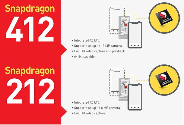 Qualcomm introduced the Snapdragon 410 and Snapdragon 210 chips last September, and now they launch upgraded versions of these processors for entry-level smartphones. Dubbed Snapdragon 412 and Snapdragon 212, these new processors offer increased speeds and "the same great features as their predecessors."