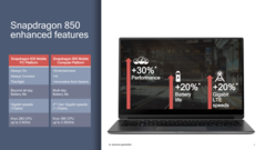 The Snapdragon 850 is built with the "2nd Generation" of 10 nm and Qualcomm was not tired to mention that Intel is still on 14 nm and has troubles bringing 10 nm to the market. The Snapdragon 850 is not pin compatible to the the older Snapdragon 835 and offers improved performance (+30% according to Qualcomm, Kyro 385 CPU cores at up to 2.95 GHz), better battery life (+20%) and with 1.2 GBit also 20% faster LTE speeds. Furthermore, due to better compability and certification, now 90% of all carriers can use Gigabit LTE on the Snapdragon 850 X20 modem (compared to 64% of all carriers with the X16 in the Snapdragon 835). Compared to the Snapdragon 845 in smartphones, the 850 has the same silicon but running at higher frequencies / power consumption.