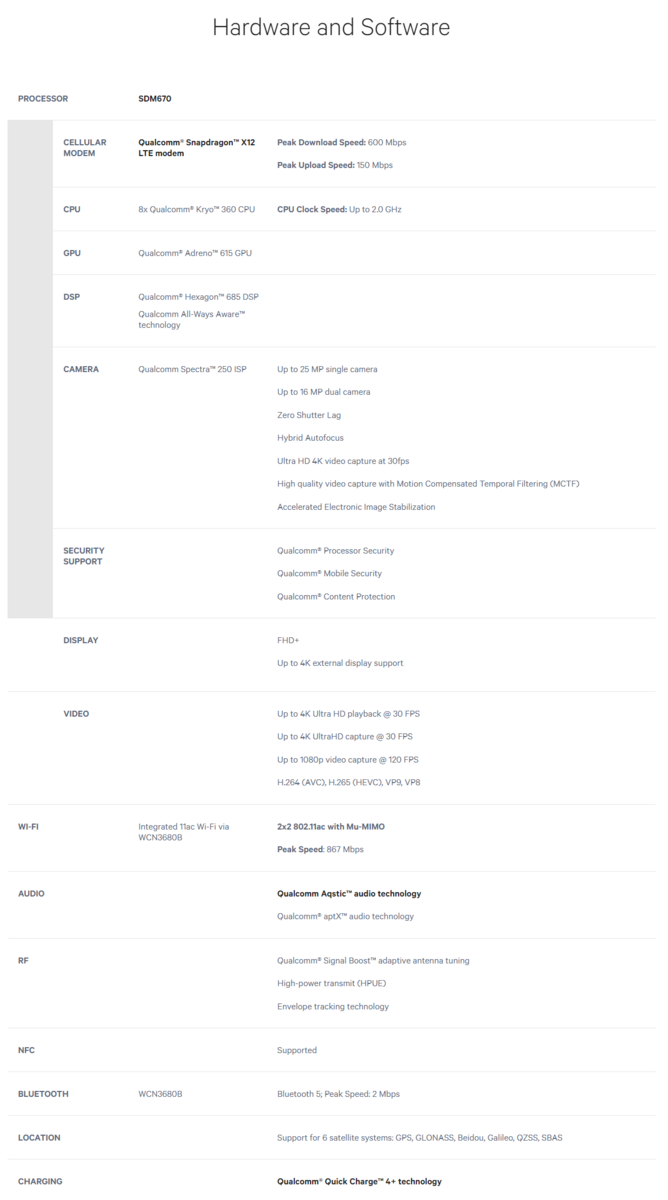 The Snapdragon 670 comes with the usual suite of connectivity options and the built-in X12 LTE modem supports download speeds up to 600 Mbps and upload speeds up to 150 Mbps. The X12 modem can automatically choose the best connection between Wi-Fi and LTE and OEMs can also add support for bridging LTE and Wi-Fi to increase download speeds.