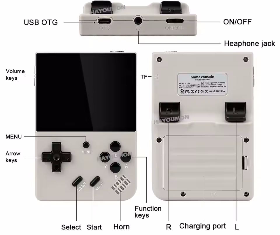 The R350S runs on a modified Linux distribution with pre-installed emulators. This operating system has been largely optimised for button navigation to compensate for the lack of a touchscreen. The handheld includes a single memory card slot at the top, alongside a second USB port and a headphone jack.