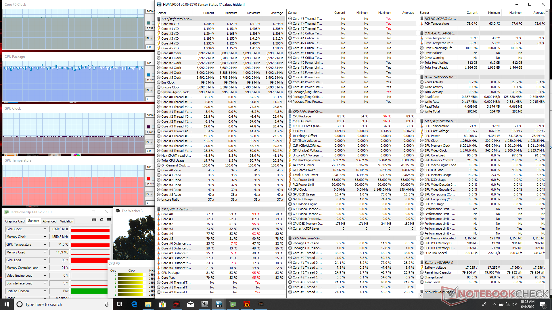 In contrast to the above, the Blade 15 has the faster-performing RTX 2080 Max-Q by about 8 to 9 percent according to 3DMark benchmarks. This is at least partially attributed to the faster GPU clock rates of the Razer. When running Witcher 3, for example, the Blade 15 GPU stabilizes at 1350 MHz compared to 1260 MHz on the GS65.