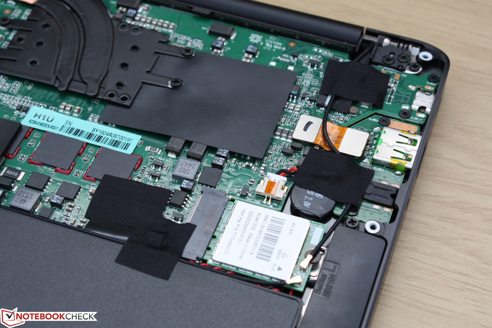The bottom panel pops out surprisingly easily with just a single T5 Hex screwdriver. Users are granted direct access to the CPU, fans, M.2 2280 SSD, battery, and M.2 2230 WLAN card. The RAM modules are soldered and non-upgradeable.