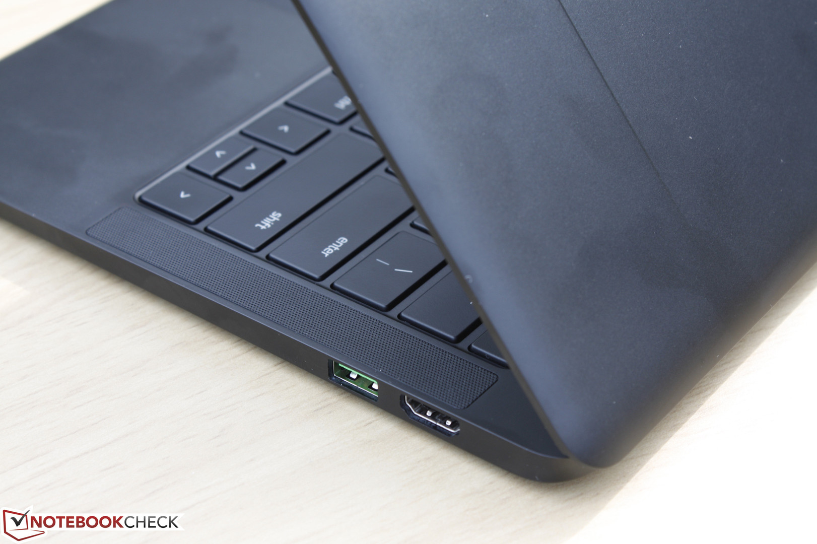 When compared to other notebooks of similar size, the 12.5-inch Razer is just as thin as the 12.0-inch MacBook 12 while having a larger footprint than both the Apple and the recently released 13.3-inch XPS 13 9350. There's no denying that the Blade Stealth has quite the wide display bezel at about 23 mm compared to just 7 mm on the XPS 13, so it's unsurprising that it can be as long and wide as some 13.3-inch notebooks. Razer tells us that the larger dimensions are necessary in order to properly integrate the high-end touchscreen. Nonetheless, the Blade Stealth is naturally portable and lighter than the MacBook Pro Retina 13 (1.6 kg vs 1.3 kg). The 12.5-inch EliteBook Folio 1020 is slightly lighter (1.2 kg vs. 1.3 kg) due in part to its weaker hardware.