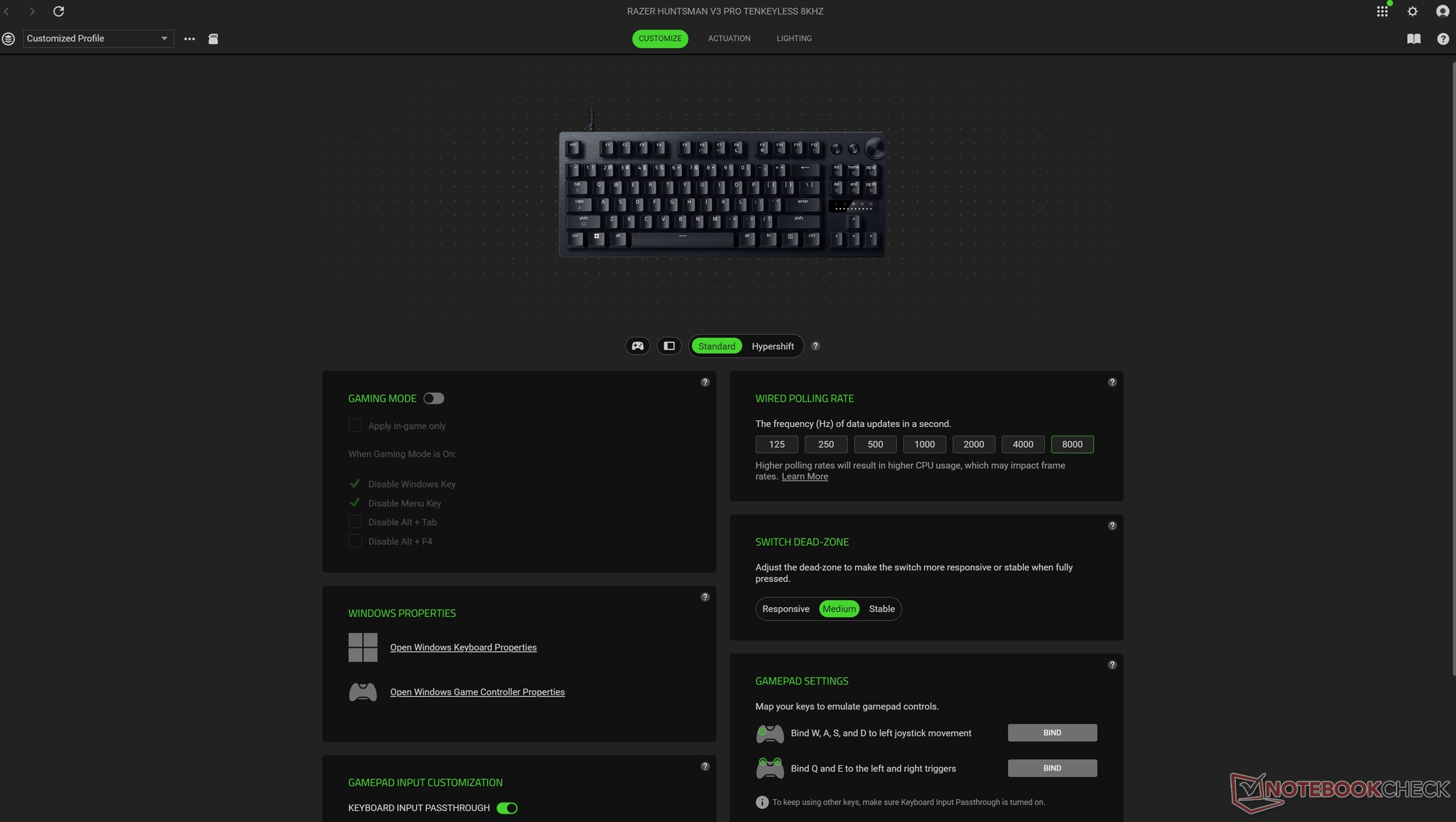 The updated Huntsman is feature-packed, which can make navigating Synapse's menus intimidating. Even so, Razer managed to divide the app into three tabs: Customize, Actuation, and Lighting. Customization allows gamers to tweak the polling rate or toggle options like Gaming Mode on and off.