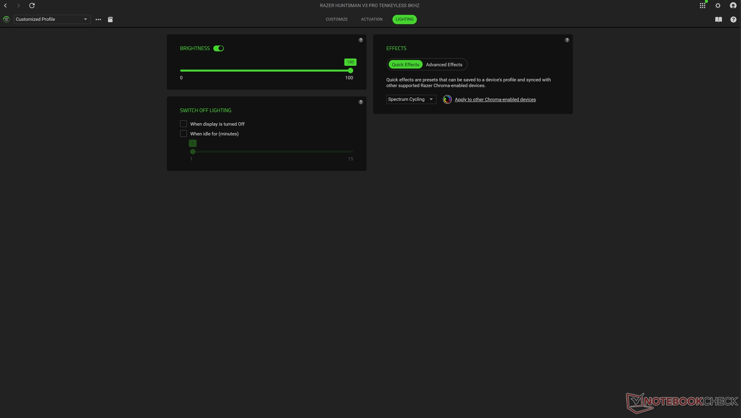 Lighting options are largely unchanged, with basic effects available in the main Synapse program. A separate Chroma Studio interface is necessary to realize the full potential of per-key lighting.