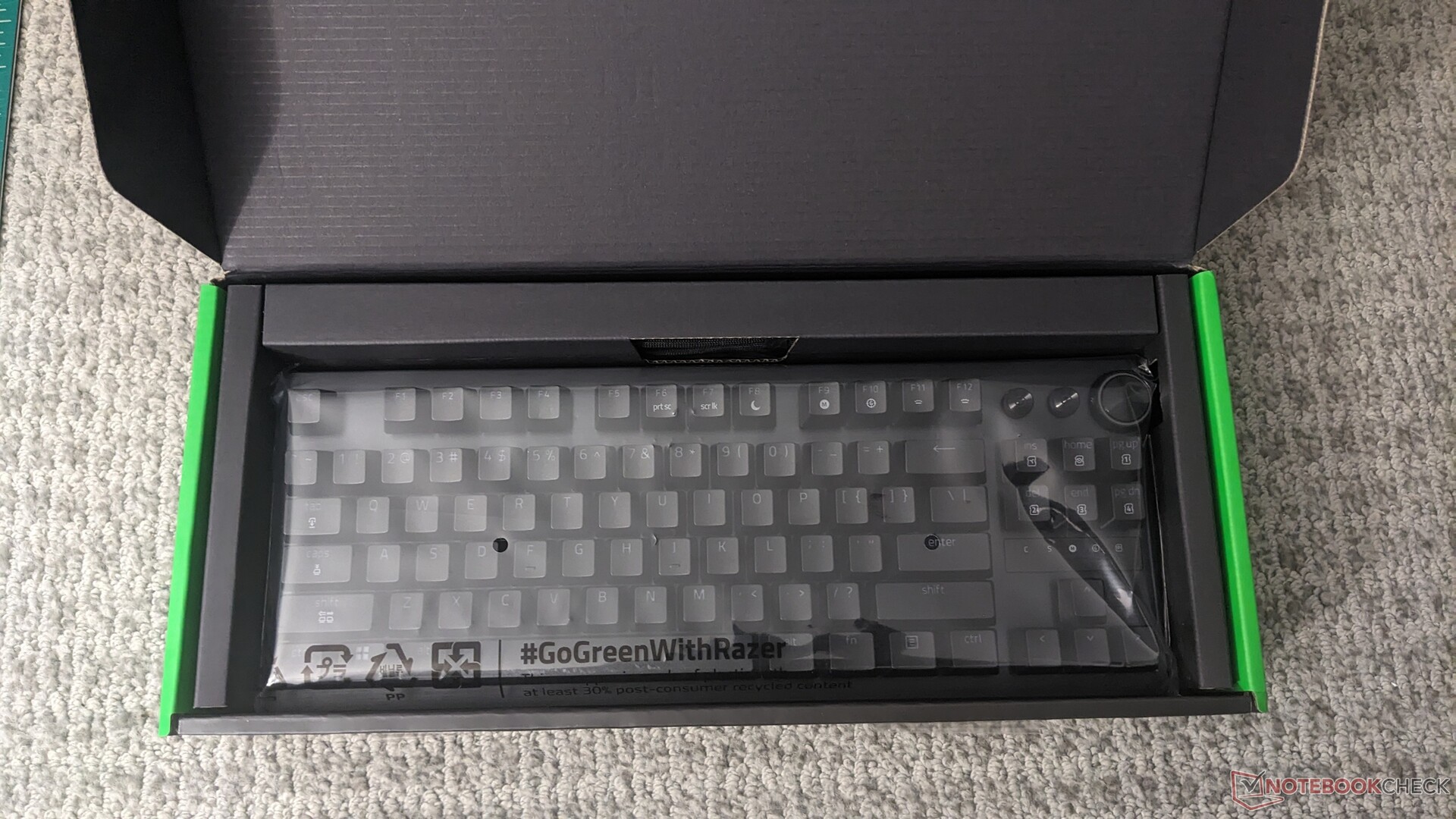The latest Razer keyboard ships in a black-and-green rectangular box. Inside, buyers will find a detachable braided USB Type A to Type C cable, magnetic leatherette wrist rest, and a quick start guide.