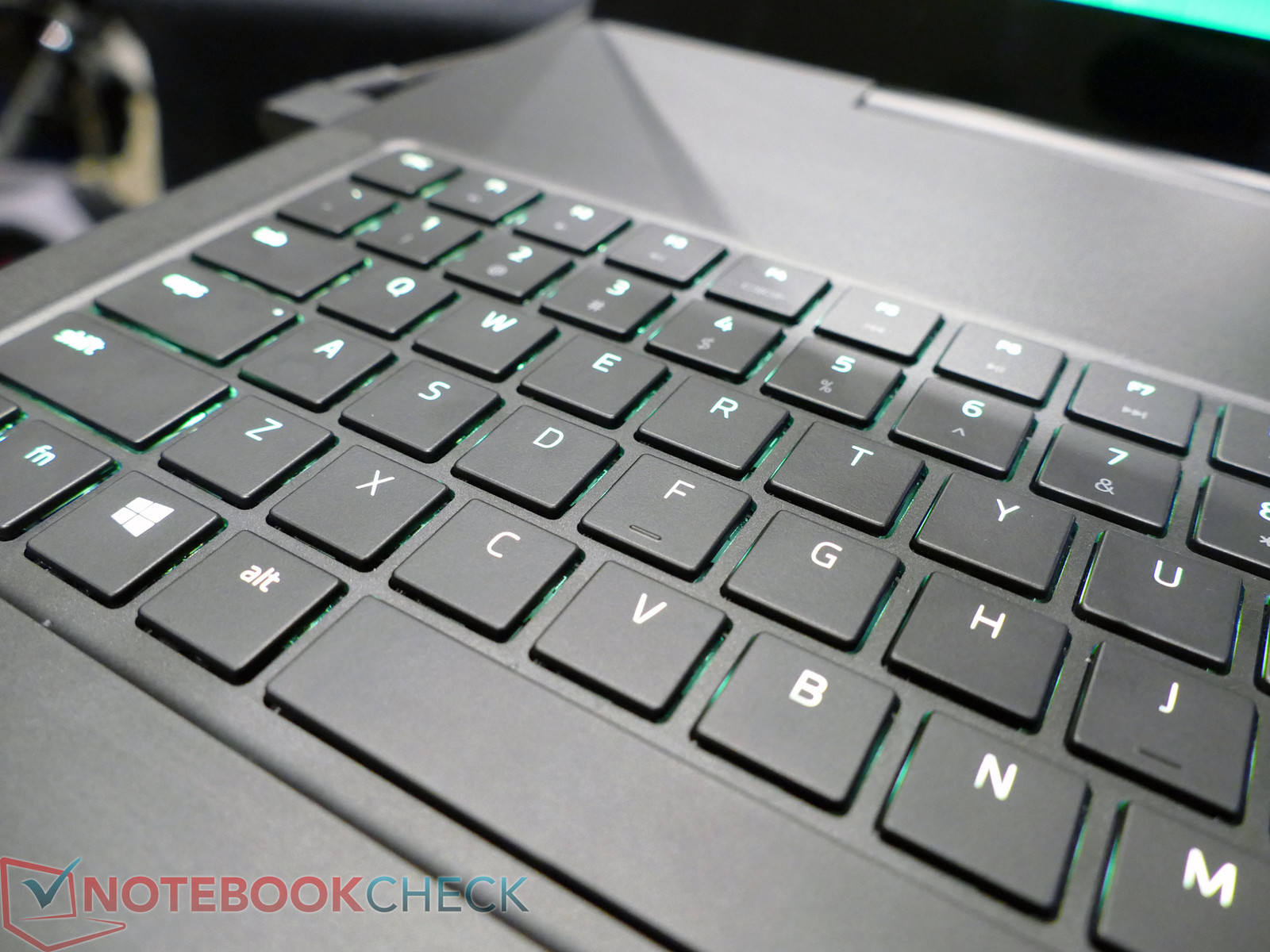 Razer is particularly proud of its mechanical keyboard with "ultra-low-profile" switches, which was developed in-house. It looks almost like a conventional chiclet keyboard, but you will quickly feel the huge difference during typing. Those keys were designed for a trigger force of 65 grams, which is also accommodated by a clearly perceptible as well as audible click. We also get the Razer Chroma illumination we already know from the smaller siblings. It allows an individual illumination of all keys as well as numerous light effects.