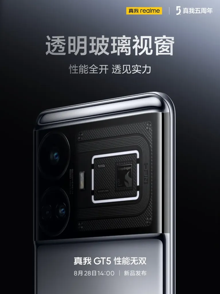 The GT5 has all the more hype to live up to as Realme's upcoming 5th anniversary flagship smartphone. Nevertheless, the OEM has revealed that it will have a second-gen camera visor with a transparent esthetic to showcase some of its potentially class-leading specs, a top-end Snapdragon processor, AI Cameras and NFC included.