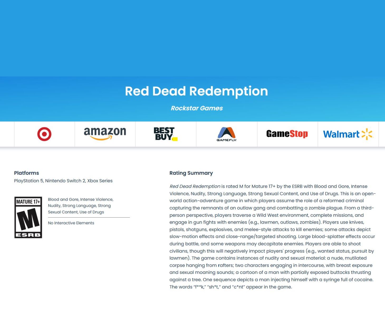 The listing includes an “M for Mature 17+” classification with descriptors such as Blood and Gore, Intense Violence, Nudity, Strong Language, Strong Sexual Content and Use of Drugs. What stands out is the platform section, which explicitly names PlayStation 5, Nintendo Switch 2 and Xbox Series systems. The ESRB clearly mentions zombies as in-game enemies, further confirming that the rating is for Red Dead Redemption 1 and its Undead Nightmare DLC campaign.