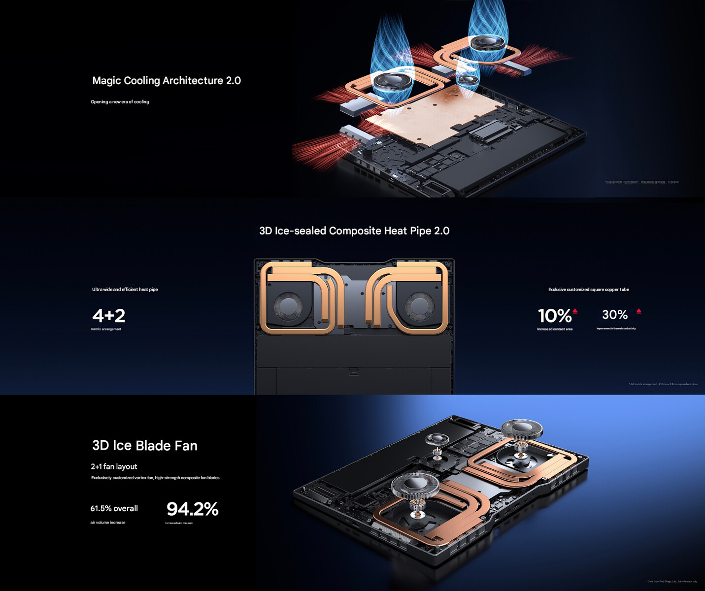 There is another option with the RTX 5080, a capable high-end laptop GPU. RedMagic highlights that the CPU and GPU are paired with the Magic Cooling Architecture 2.0, which is said to keep the system cool during heavy loads. The design is claimed to allow higher airflow than the predecessor, and there are a total of three active fans.