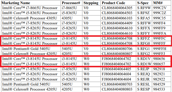 A Product Change Notification was sent out by Intel on April 9 that includes four mentions of the i3-8145U with four different S-Spec numbers (V0 stepping: S RFFZ, S RFG0; W0 stepping: S RD1V, S RD1W). It seems the S RD1V variant differed from the S RD1W model because of its additional features such as Enhanced SpeedStep technology and support for Intel Software Guard Extensions (SGX).