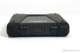 The case of the ADATA HD650 is made of a combination of a plastic body and a protective silicone cover. The latter protects the edges in case of an impact. The hard drive inside the case, a Toshiba MQ01ABF050 2.5-inch HDD, is protected by silicone as well. The plastic case itself has a surface pattern and looks like carbon. The HDD leaves a nice and high-quality impression if you do not look too closely. You can, however, see some smaller irregularities in regard to the gaps. Overall, the build quality and the stability are on a very good level.