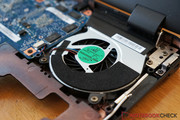 System maintenance proves to be simple: the 2.5" slot, the SSD's mSATA slot, the WLAN adaptor and the separate memory slot are all easily accessible via a maintenance hatch. The entire topside, including the keyboard, can also be readily detached by simply removing the Philips screws from the underside and around the fans and the DVD slot. The keyboard and trackpad are connected by a flat ribbon cable and removing them is relatively simple. Reconnecting the touchpad cable, however, can prove to be very fiddly. The fans become accessible as well for cleaning purposes.