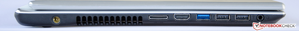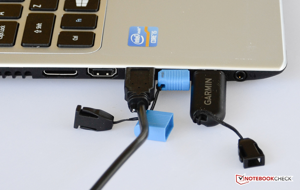 The port selection is also standard fare: the Aspire V5 offers two USB 2.0 ports and one port supporting the faster USB 3.0 standard. We do have a real issue with the placement: all three ports are located next to each other on the left side and pushed towards the very front of the notebook. To make matters worse, the HDMI port and the proprietary port for the Ethernet/VGA dongle are also housed on the left side in the front half of the notebook. Especially lefthanders are going to have issues with cables and devices crowding the workspace. The USB ports are also extremely close together, so larger thumb drives and other devices might not fit. While a DisplayPort would have been a nice addition, we didn't really expected to find one on this rather inexpensive notebook.