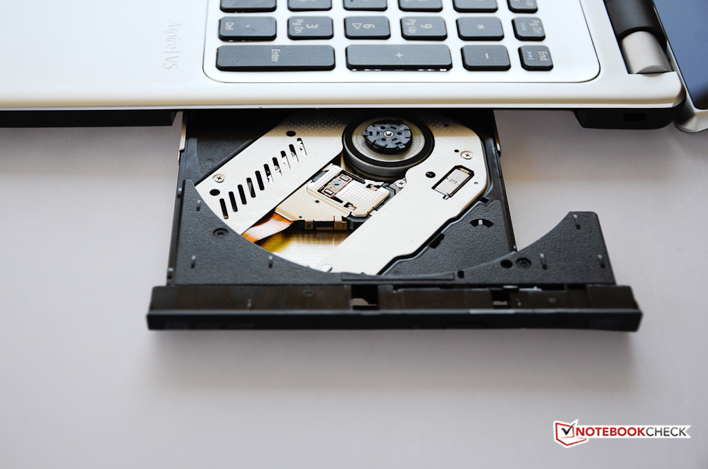 Despite the pleasingly slim design and the ULV processor, the V5-571P-6499 does not quite meet Intel's Ultrabook thickness-standard, which dictates a maximum of 0.83 inches for systems with 14-inch and larger displays. The V5-571P-6499 measures 15 x 10 x 1 inches and weighs in at a reasonable 5.3 pounds (6.0 pounds including the power adapter). While the silver-colored chassis may evoke the look of brushed aluminum at first, there is no mistaking the fact that it's made entirely from plastic - but that's not really surprising given the low price point. The bottom of the base unit as well as the (removable) battery are black plastic. We do appreciate the fact that Acer managed to integrate an optical drive (8X DVD±RW DL) into the quite modern looking and slim design. The battery - a skinny 4 cell model - is not integrated permanently, but snaps in and can be easily replaced by the user.