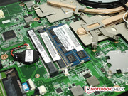 The bottom proves to be a mix of air vents and component covers. There is only one of the latter, which might prove annoying for the customer. The manufacturer only allows uncovering the hard disk without ado, if desired. The installed data carrier can be exchanged subsequently. It's not possible to access the other components (CPU, GPU, fan, etc.) without almost completely disassembling the notebook. A stop has been put to possible, uncomplicated upgrades in this case. This is especially aggravating since it was still easily possible in the 2010 version of the 5740z.