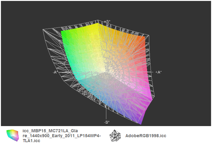 As far as the range of colors that can be displayed on the screen goes, we found this display to cover the sRGB color space quite well. This puts the MBP 15 Early 2011 on par with its predecessor from 2010. The MBP 15 (1680x1050 WSXGA+) with a sharper resolution still places at about the same level in terms of color space. Compared to a typical display, like in the HP Envy 15, we can see the superiority of the MacBook Pro's screen. Compared to a premium-grade screen, like in the Dell XPS 16 RGB, the MacBook Pro, however, does not even come close to covering the same color space.