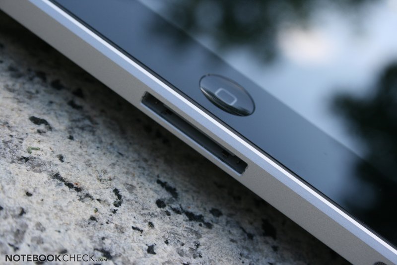 The built-in mono loudspeaker is on the iPad's bottom side. The position doesn't really matter because of the tablet's rotation, but it is often covered unintentionally by the hand. That's why two loudspeakers would sometimes be desirable and might even create a stereo feeling. The quality is good for the small size and suffices for movies and gaming sounds. Even background music via internet radio or the iPod function can satisfy undemanding users. In our opinion, the maximum volume is also sufficient for watching videos with two persons.