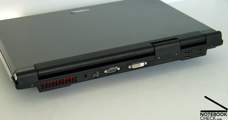 At the back side there are the following ports: 4x USB 2.0, DVI-D, VGA-Out, S-Video Out and a Kensington lock. In the right region there are the vent holes of the fans.