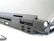 The ports are sensibly placed at the back regions of the notebook. At the front edge there aren't any ports besides the infrared port (CIR - remote control). At the right side there are only the DVD drive and the network adapter, which is ideally for right-hander, because the work area of the mouse is not essentially limited.