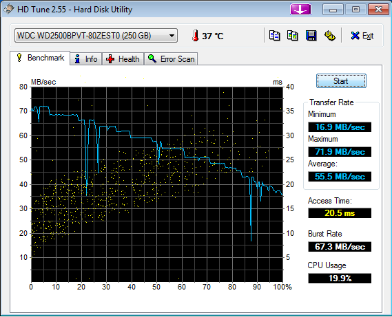 About 250 GB have to suffice as memory capacity in the Eee PC. This is how much the Western Digital hard disk has to offer. The hard disk in a 2.5 inch format, with the model label WDC WD2500BPVT-80ZEST0, rotates at 5400 revolutions per minute. The rates assessed with HDTune and CrystalDiskMark aren't exactly awesome. According to HDTune, the Asus system manages an average transfer rate of meager 55.5 MB/s. Only exchanging the disk can help here. An SSD would be a good alternative.
