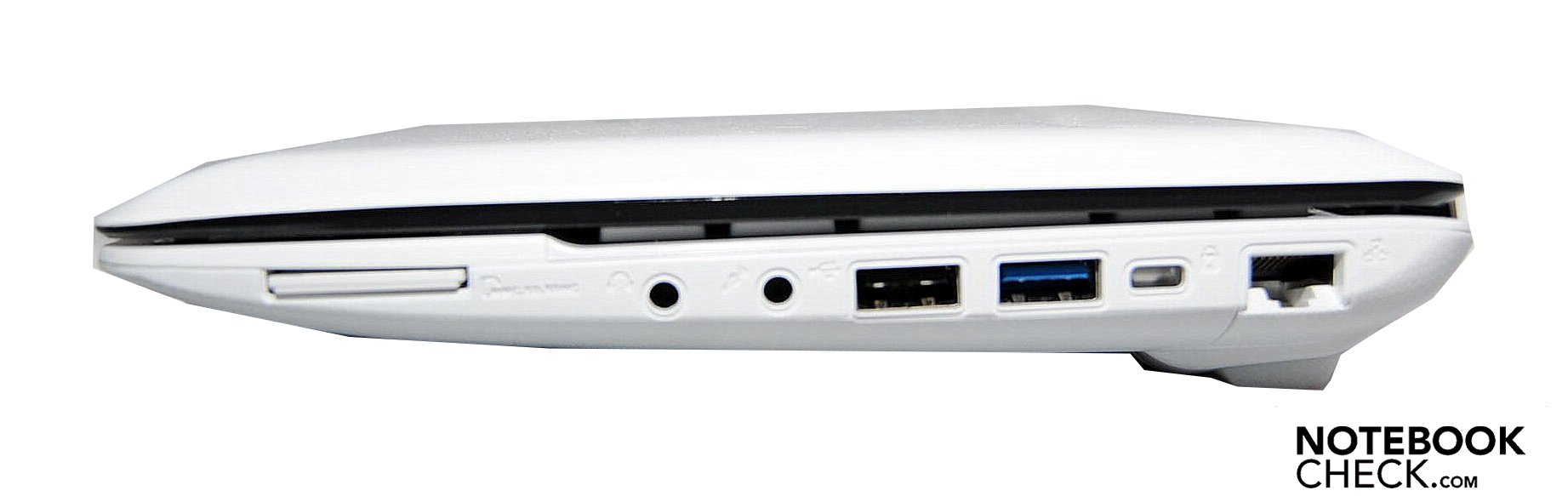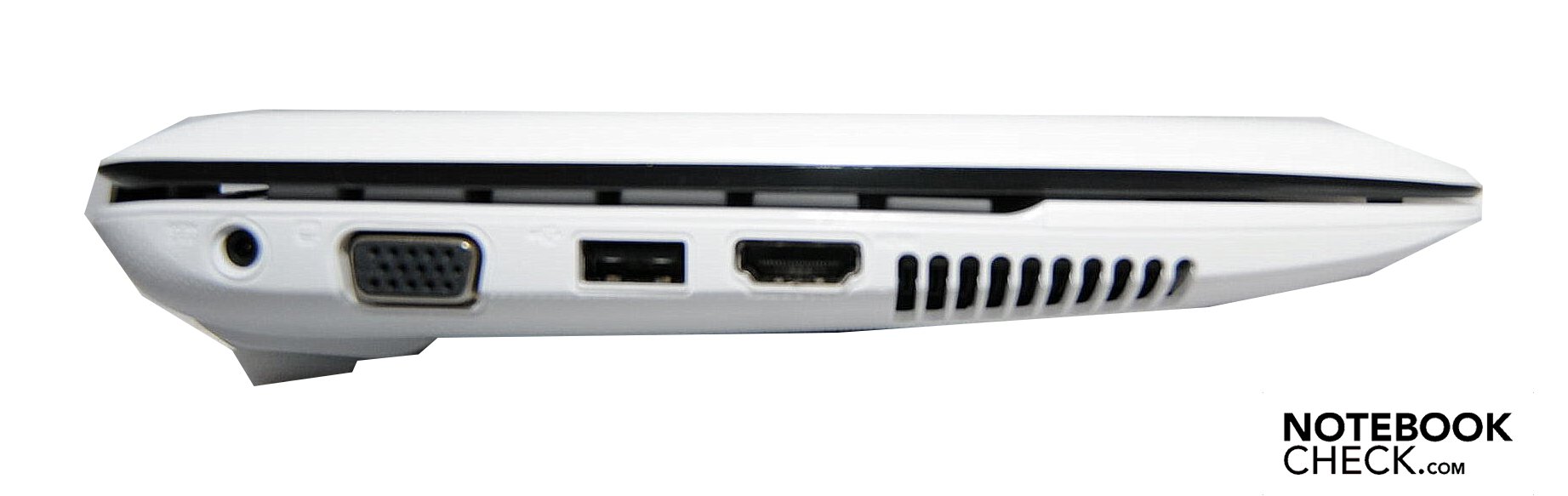 The Asus Eee PC 1015B's interfaces are located only on the netbook's left and right. In addition to two USB 2.0 ports, a fast USB 3.0 port has also been installed. That is still unusual among netbooks. It also stands out from the other ports due to its blue color. In addition to the VGA socket, there is also a HDMI interface available for connecting the netbook to larger monitors. We only miss an eSATA port. A 0.3 megapixel webcam with privacy cover has been built into the display bezel. You can't expect much from the small recording device, but it should be sufficient for short video conferences.