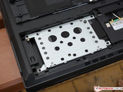 We can't say why the "shock resistant hard disk" is allegedly better than in every other laptop. As in every other device, the HDD is screwed directly to the chassis without rubber buffers. Only a rubber area absorbs shocks from the bottom. The HDD model, WDC WD3200BPVT, isn't any more shock resistant than any other notebook HDD.