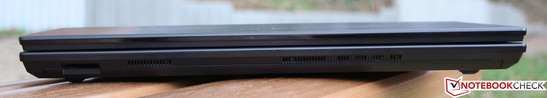 The 15.6 inch laptop is comparatively heavy with 2593 grams plus 223 grams for the power adapter. Light office devices in this size weigh 2.3 to 2.4 kilograms. However, most users won't complain about the weight: The good rigidity of base unit, lid and hinges console and mellow the scales result. We can hardly twist the base unit with both hands. We can't depress the base plate anywhere with exception of the optical drive. As so often, the drive is the bottom's weak point. The base plate can be moved here.