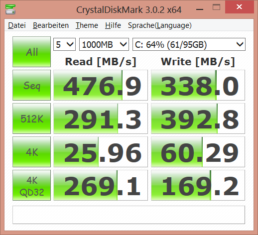 We assessed the access and write times of the SanDisk SSD via the CrystalDiskMark and AS SSD tools. They confirmed the high data rates in writing again. The work speed of the SATA drive is, as expected, impressively fast. That is particularly noticed in the boot time of just over 10 seconds and instantaneous program starts, which allow the user to pursue routine work swiftly and almost without waiting times.